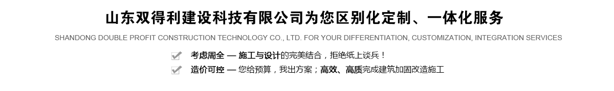 山東雙得利建設科技有限公司是一家集科研、工程技術開發、咨詢、工程結構加固改造檢測、設計、施工于一體的綜合性、專業化企業。公司注冊資金5001萬元,具備建筑工程施工總承包貳級、主體結構工程檢測、特種工程結構補強專業承包不分等級、地基基礎工程專業承包貳級、防水防腐保溫工程專業承包貳級、施工勞務不分等級資質。現有高素質人才126人,其中高級工程師6人,一級注冊結構工程師2人,一級注冊建造師3人,一級注冊造價師2人,注冊監理工程師2人,二級注冊結構工程師4人,二級注冊建造師10人,中級工程師30余人,其他專業技術人員30余人。公司所有工程技術人員均從事工程施工行業多年。